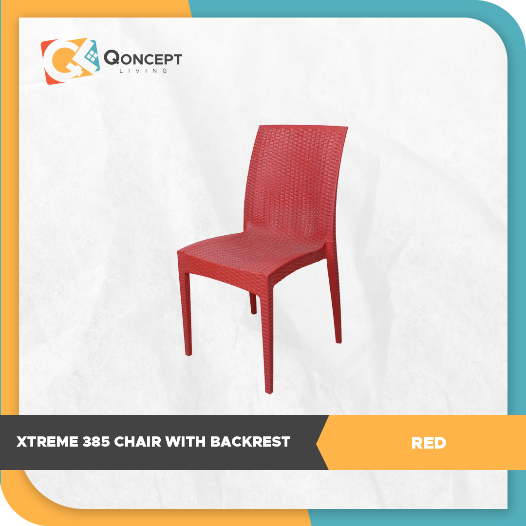 - This product is a chair designed with a backrest, specifically the Qoncept Xtreme 385 model. The chair is colored red